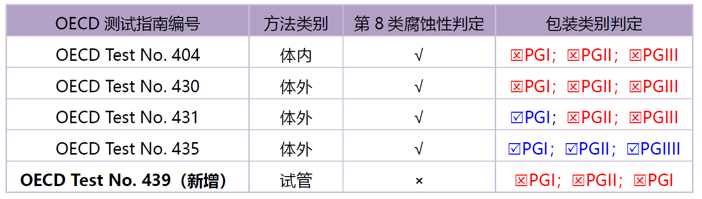 为了和GHS第8修订版保持一致,本次修订在对化学品皮肤腐蚀危害评估时,新增了OECD 测试指南439(重组人类表皮试验方法)。但是,该方法的测试结果无法直接判断货物是否属于第8类腐蚀品以及具体的包装类别,因此,本次修订只是明确,如果OECD 439测试结果为不分类(non-classified in accordance with OECD Test Guideline No. 439),则可判断该化学品不属于第8类腐蚀品。